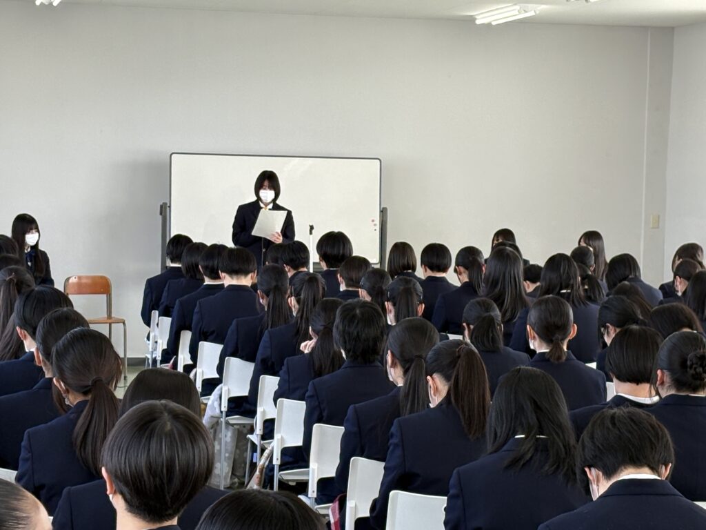 2月3日、進路説明会が行われ、すでに進路を決めている3年生代表5名が合格までの体験談を1・2年生に話しました。考査の直前、そして進級をひかえる1・2年生は、3年生がどのように目標を見つけ、そして夢の実現のために何をしてきたか等、代表者の話を一生懸命に聞く姿が見られました。一つでも多くのことを吸収し、自分たちの進路に活かしてほしいと思います。